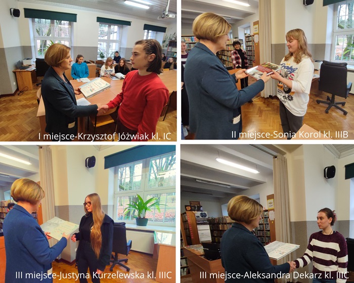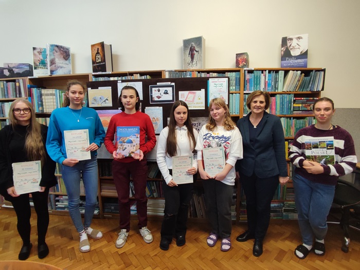 Podsumowanie konkursu plastycznego oraz wręczenie nagród zwycięzcom i dyplomów oraz upominków wszystkim uczestnikom miało miejsce 15 listopada 2023 r. w czytelni. Dyplomy, nagrody i upominki ufundowane przez Radę Rodziców, wręczyła dyrektor Bożena Krzyżanowska.
