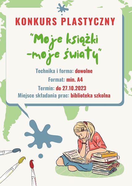 Tegoroczny konkurs, plastyczny, przebiegał pod hasłem „Moje książki- moje światy”. Do dnia 27 października 2023 r. 9 osób złożyło w bibliotece szkolnej wykonane przez siebie prace plastyczne inspirowane lekturami.
