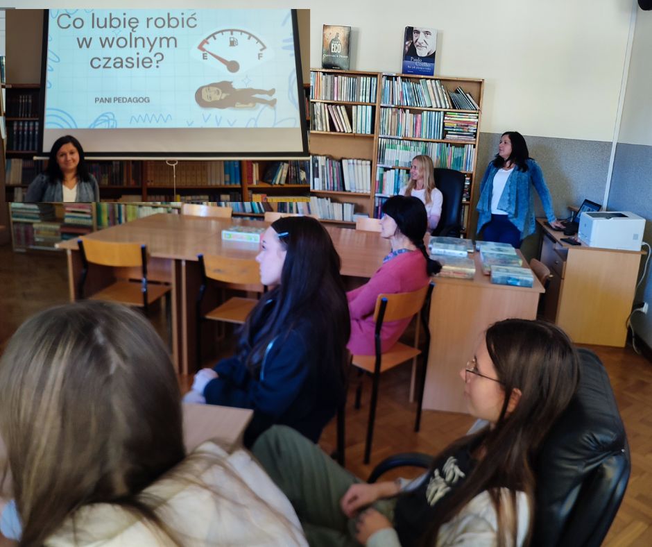 W poniedziałek 28.10.2024 r. w bibliotece szkolnej miało miejsce czwarte, ostatnie już, spotkanie z cyklu „My i nasze zainteresowania”. Tym razem o tym, co robią w wolnym czasie opowiedziały: Justyna Owczarska, nauczycielka języka angielskiego oraz Ola, uczennica klasy maturalnej.
