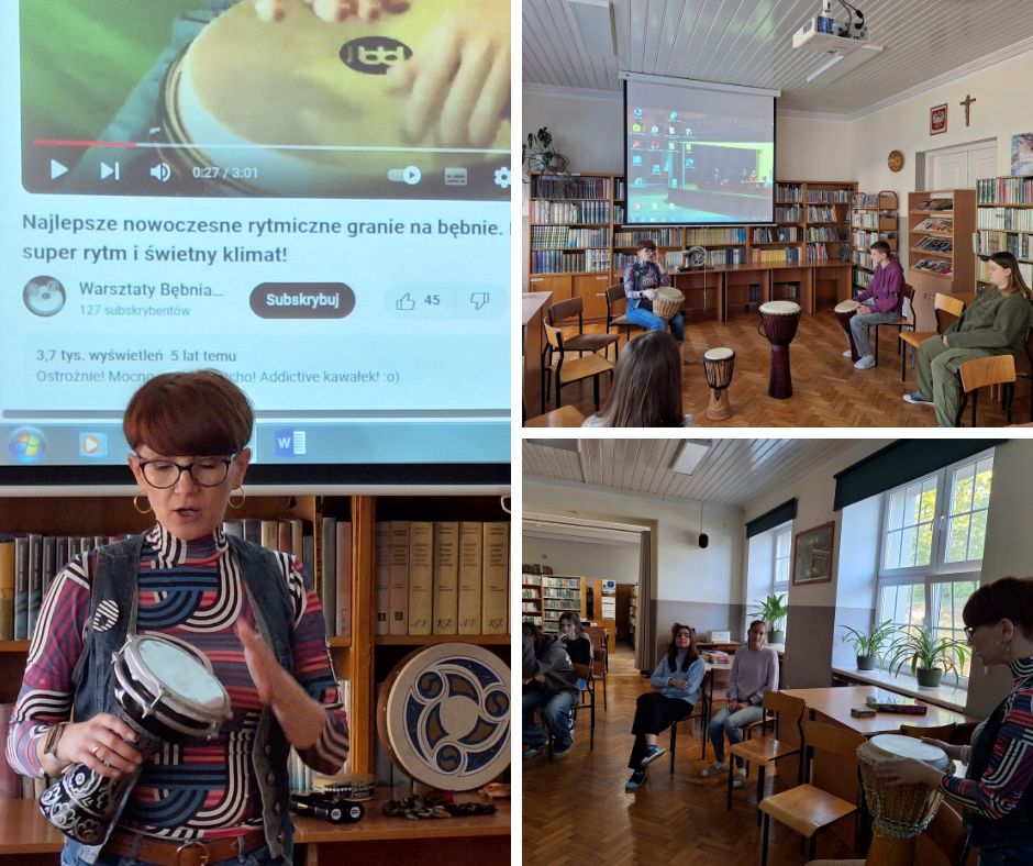 Podczas spotkania w bibliotece opowiedziała młodzieży o różnych, także tych mało znanych, instrumentach perkusyjnych. Prezentowane filmiki pokazały, jak one brzmią w zespole muzycznym i w jakich kulturach są używane. Djembe, cajon, bodhrάn, darbuka- takie cudeńka można było zobaczyć, usłyszeć, ale także dotknąć, a nawet nauczyć się troszkę na nich grać, gdyż pani Urszula Burakowska przeprowadziła krótkie warsztaty dla chętnych.